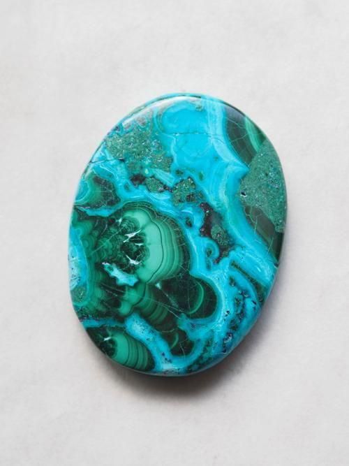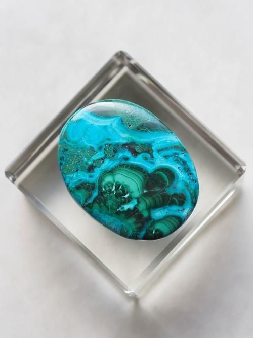 水色の部分はクリソコラ、緑の部分はマラカイトと共生する「クリソコラマラカイト」。