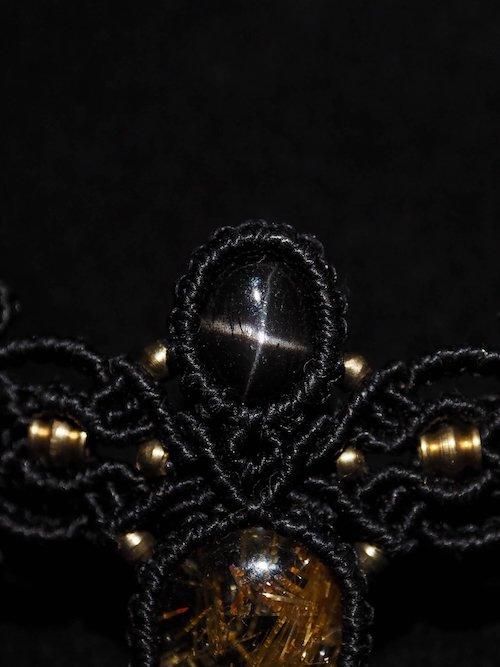 シャープな十字線がくっきりと浮かび上がる上質なブラックスターと、照りの強い輝きを見せる上質なルチルクォーツをあしらったデザインブレスレット。
