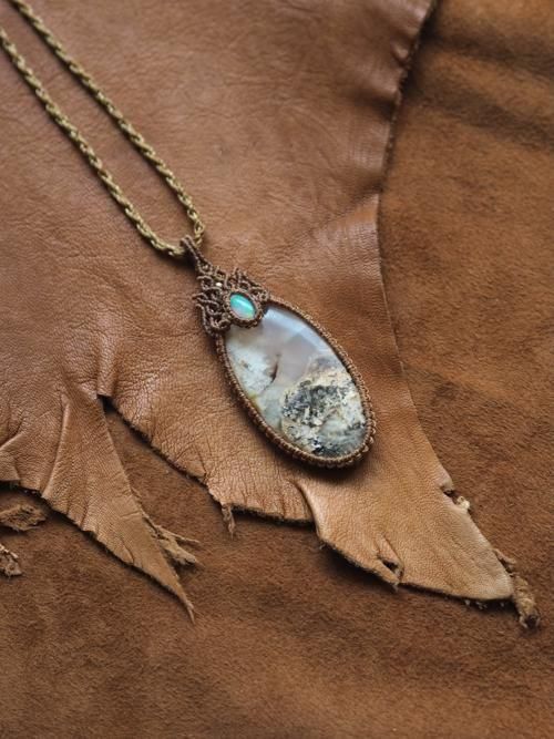 タイガーの柄のようなインクルージョンが個性的な上質のタイガーデンドライトアゲートをメインに、小粒ながらもキラキラと美しい色鮮やかな浮遊色を見せる宝石品質のプレシャスオパールをあしらった、魅力溢れる贅沢なダブルストーンペンダント。