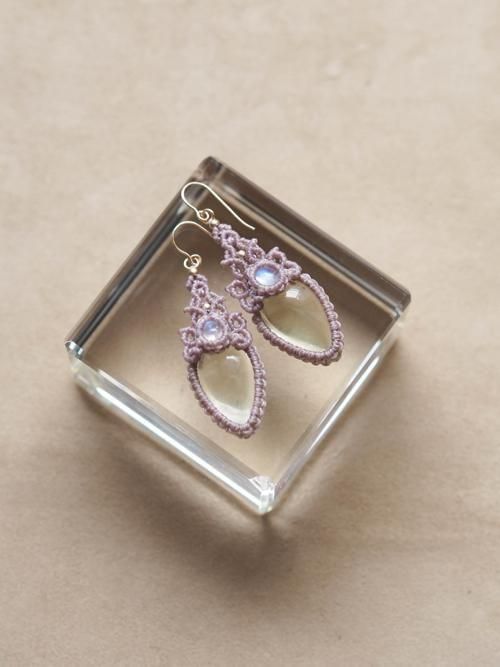 艶のある透明感に爽やかなレモンイエローが印象的な上質なレモンクォーツと、ブルーの神秘的なシラーが輝く美しいムーンストーンをあしらったダブルストーンマクラメ編みペアピアス。