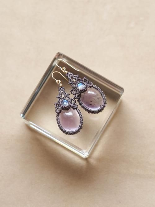艶のある透明感に気品溢れるパープル色が印象的な上質なアメジストと、ブルーの神秘的なシラーが輝く美しいムーンストーンをあしらったダブルストーンマクラメ編みペアピアス。