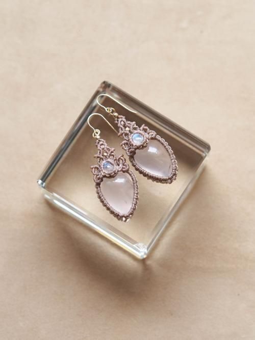 優しい色味の桜色に艶やかさを兼ね備えた美しいローズクォーツと、ブルーの神秘的なシラーが輝く美しいムーンストーンをあしらったダブルストーンマクラメ編みペアピアス。