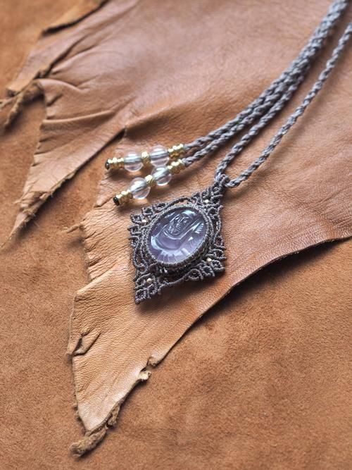 幸運と智慧の象徴のガネーシャが彫刻されたルースを使用し、繊細なマクラメ編みで編み上げた特別なペンダント。