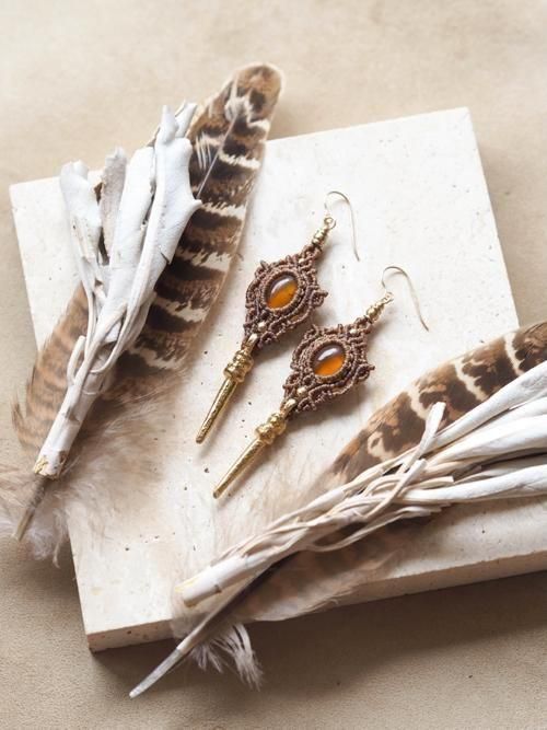 そのバルティックアンバーと真鍮ビーズをあしらったマクラメ編みペアピアス。