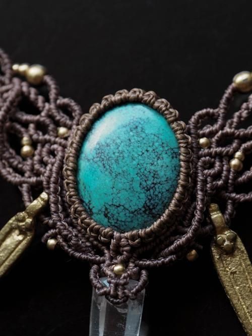 天然石が引き立つよう蝋引き糸を厳選し、繊細な編み目とアクセントに真鍮のビーズ贅沢にあしらいひと編みひと編み丁寧に編み上げています。