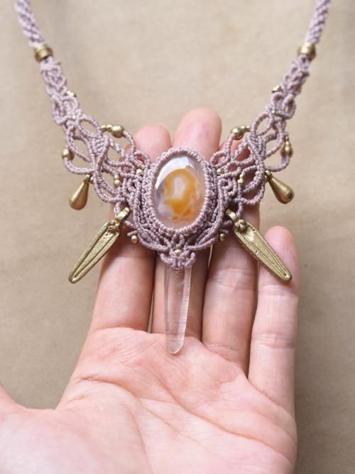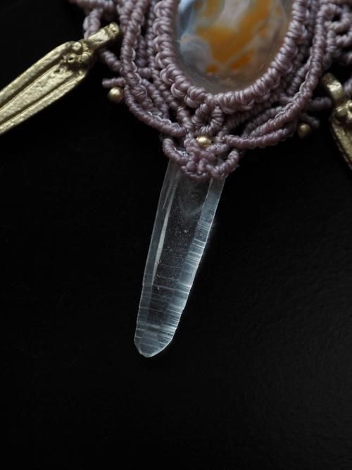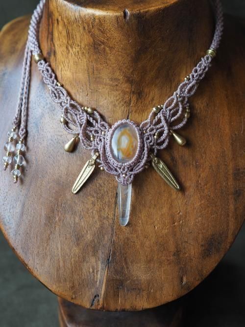 天然石が引き立つよう蝋引き糸を厳選し、繊細な編み目とアクセントに真鍮のビーズ贅沢にあしらいひと編みひと編み丁寧に編み上げています。