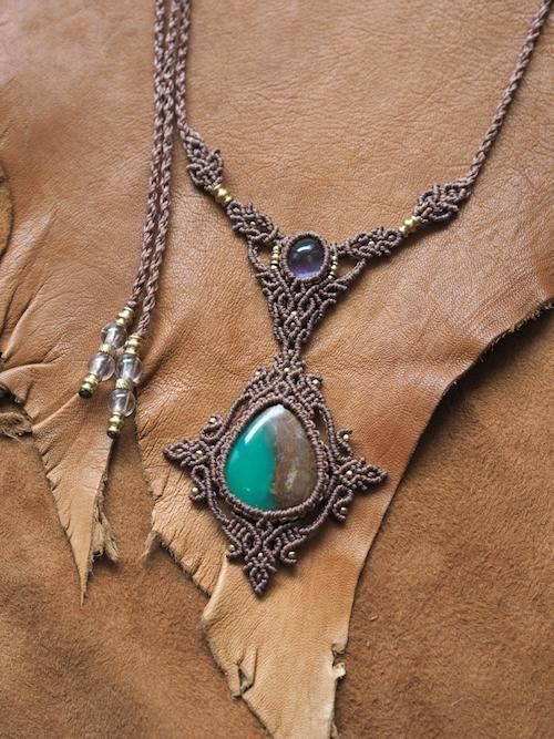 透明感を感じる色鮮やかなグリーンの中に母岩が混ざり合った上質なクリソプレーズと、高貴かつ深みのある色味のアメジストをあしらったデザインネックレス。