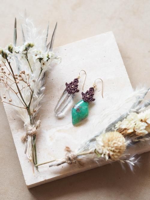 色鮮やかなアップルグリーンとインクルージョンが合わさった風合いのある上質なクリソプレーズに、力強い氷柱に艶やかな透明感が魅力のヒマラヤ水晶を左右別々にあしらったマクラメ編みアシンメトリーピアス。