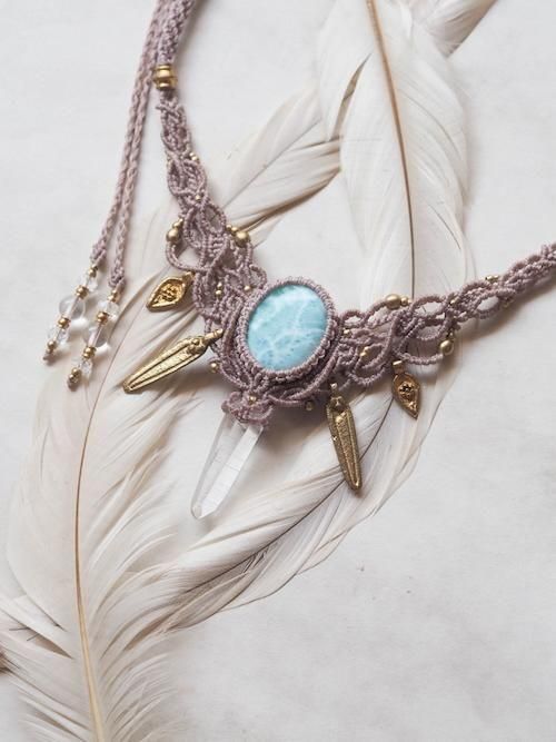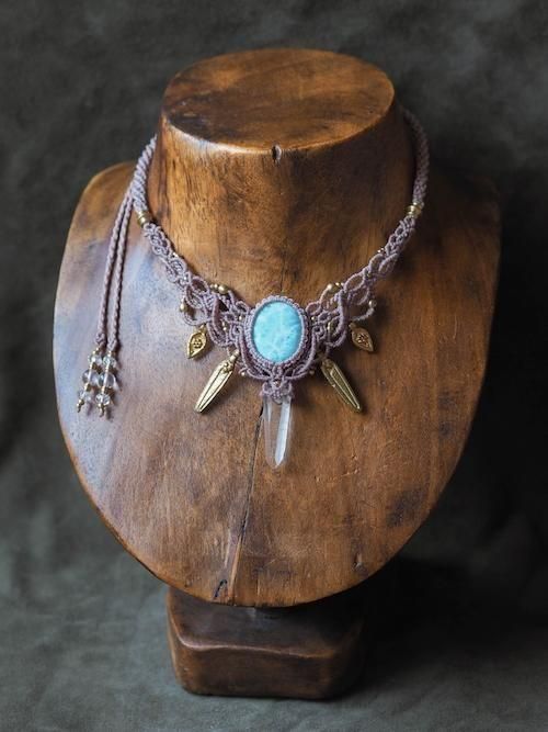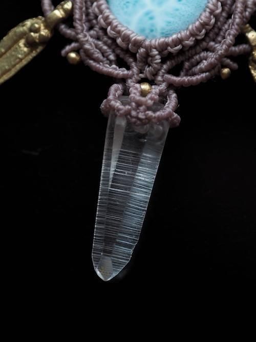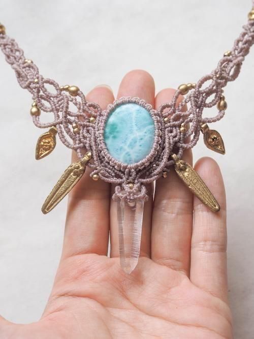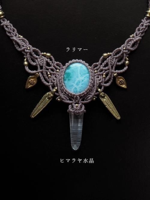 澄んだスカイブルーと水面のように揺れる模様が際立つ上質なラリマーと、神秘的な佇まいが印象的なヒマラヤ水晶、アクセントの真鍮ビーズを贅沢にあしらったデザインネックレス。